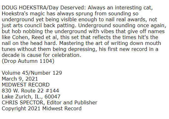Getting nice feedback on the first listens from the forthcoming album The Day Deserved. One writes and records in a bit of a vacuum, so it becomes real when folks hear it and engage – thanks. The pre-sale is up at Bandcamp, videos and singles are dropping, and we’re starting to get some nice pre-release reviews, including this nice bit from Midwest Record. “…his first new record in a decade is cause for celebration.” Magic.