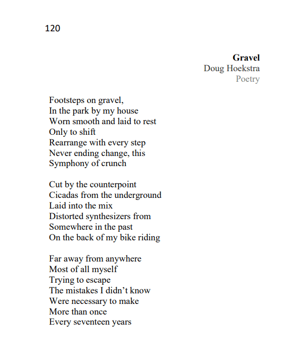Posted byDoug HoekstraPosted in2022, challenge, change, childhood, connections, equanimity, freedom, ideas, impermanence, Life, memory, movies, Music, observation, perspective, place, Poetry, redemption, sound, synchronicity, time, Writing, zenTags:2022 poetry, barnes and noble, childhood, cicadas, counterpoint, Doug Hoekstra, gravel, literary journals, movies, nashville writers, the door is ajar, the town tamer