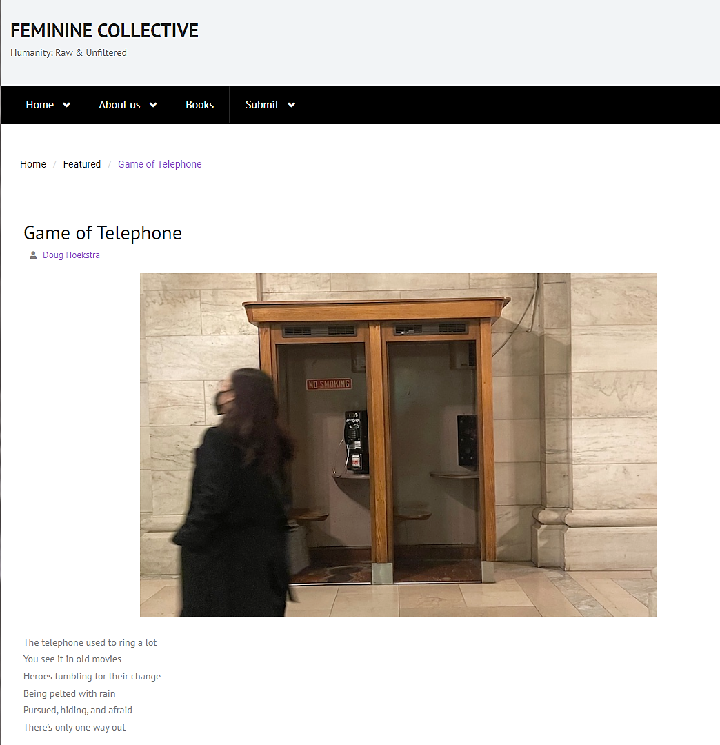 Pleased to share another new poem of mine, “Game of Telephone,“ which appears in the latest issue of Feminine Collective, a fine online publication featuring poems and stories by writers dealing in “humanity, raw and unfiltered.” Authenticity as the compass. Founded a decade ago, by writer/model Julie Anderson, FC’s mission is to empower, educate, and entertain – grateful to be a part of this community with this work and others I’ve contributed over the past few years. Hope you can check it out and spend some time perusing the other fine writers therein. Enjoy!