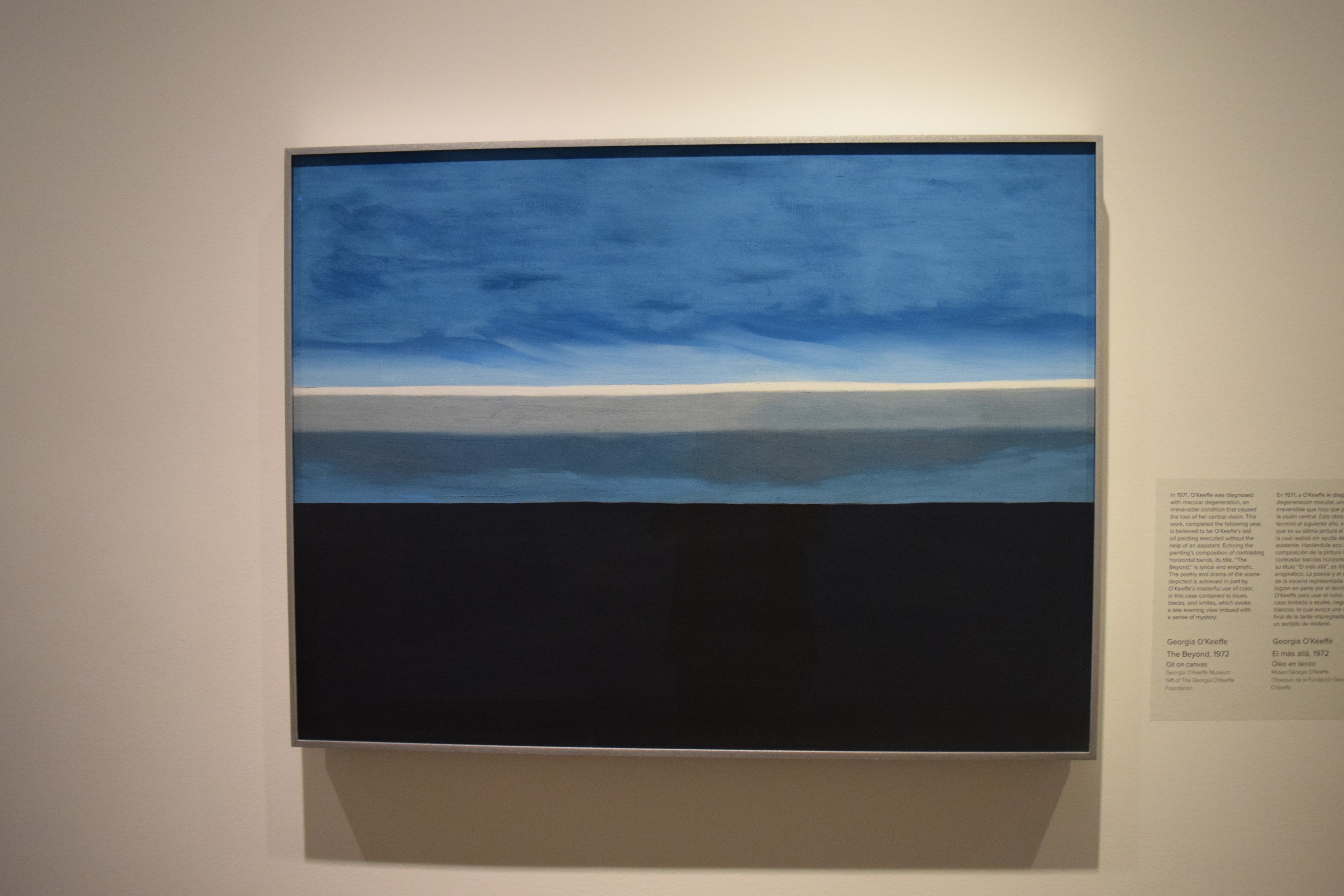 I thought it was interesting how Georgia did countless paintings of one door in the courtyard, trying to always look at it differently, to get it just a little more “right.” She was always pushing forward, and at the end of her life, when macular degeneration took her eyesight (this happened to my mom), she did one last painting “Beyond” that was to me, unlike any of her other work (pictured here, from the O’Keeffe museum in Santa Fe). Then she switched to pottery. At the end of her life (nearing 100), she had a bell by her bed and an in-house caregiver, also like my parents, and there was something poignant about that, as well, and a reminder that we are all more connected than we think. But art does that too.