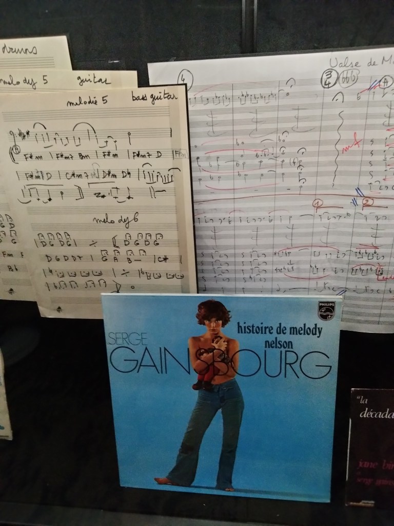 The museum tour, which is really just as good, is more leisurely and easier re; tickets. Serge always kept pushing forward as an artist, changing like Dylan or Bowie, through French chanson to jazz to pop to reggae to dance. And like those artists, the change was always uniquely him. There was lots of music, and video from various points in both of their careers; childhood mementos, photo spreads, old 45s, lyrics, sheet music, and some bric a brac that could get censored were I to include pictures. The tour exits at the Gainsbourg lounge, where cocktail music versions of his work plays from the player piano and a bartender serves up drinks. No Gitanes that I could see.