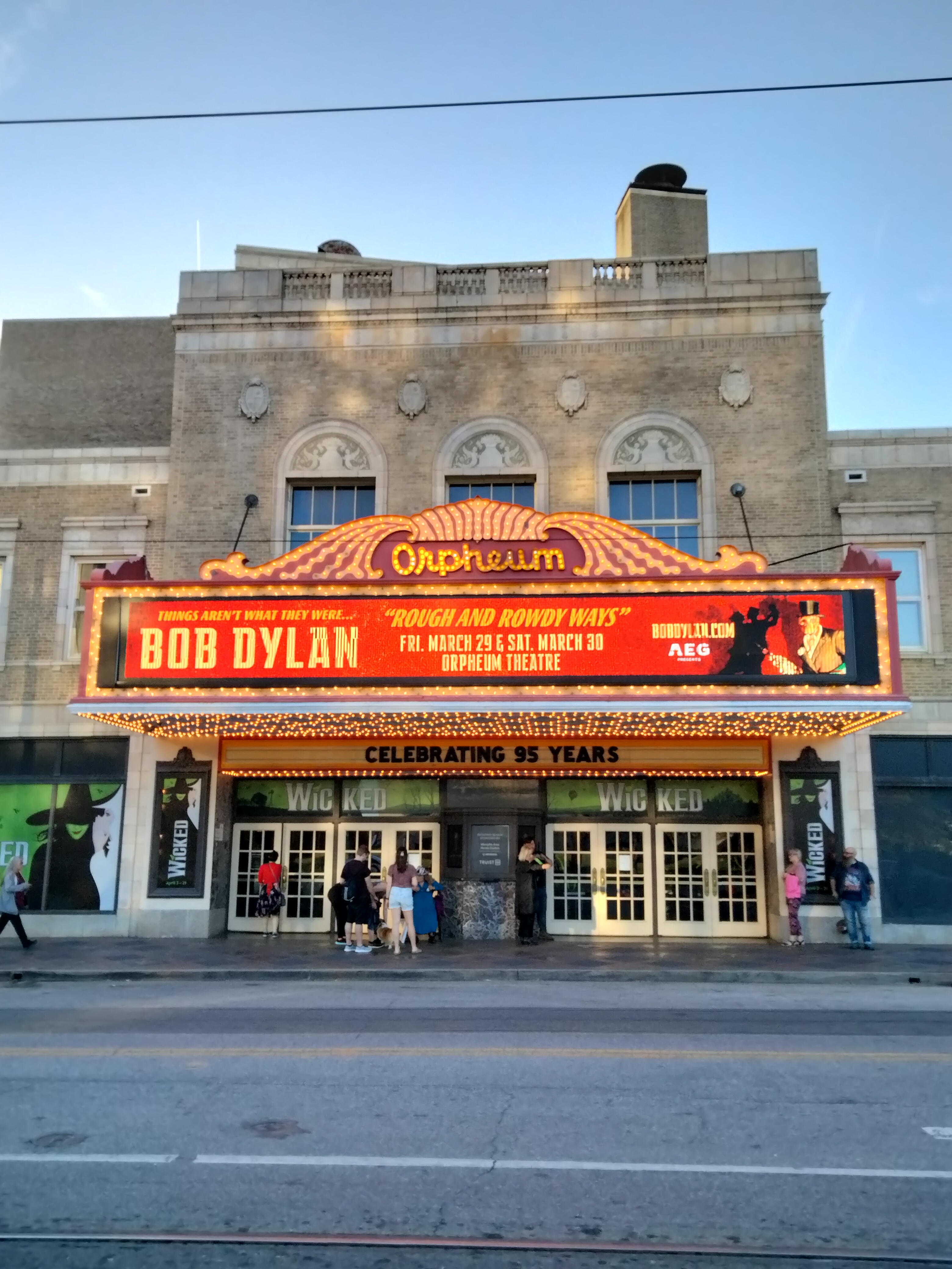 Late post from March 30, but time is an illusion, time is a jet plane, time out of mind. This was a Memphis trek, in and out to see Bobby D one more time, at the Orpheum Theater. Great old palace, Elvis loved it and rented it out a lot, before the days of movie streaming, which Elvis would’ve also loved. Last time I was there , it was to catch up with my pal George Marinelli (who for years played guitar for Bonnie Raitt) and see Bonnie’s show, which was memorable, including venturing backstage afterwards where, among other things, I met David Porter, the famous Stax songwriter. There’s a poem about it in one of my books, but I digress.