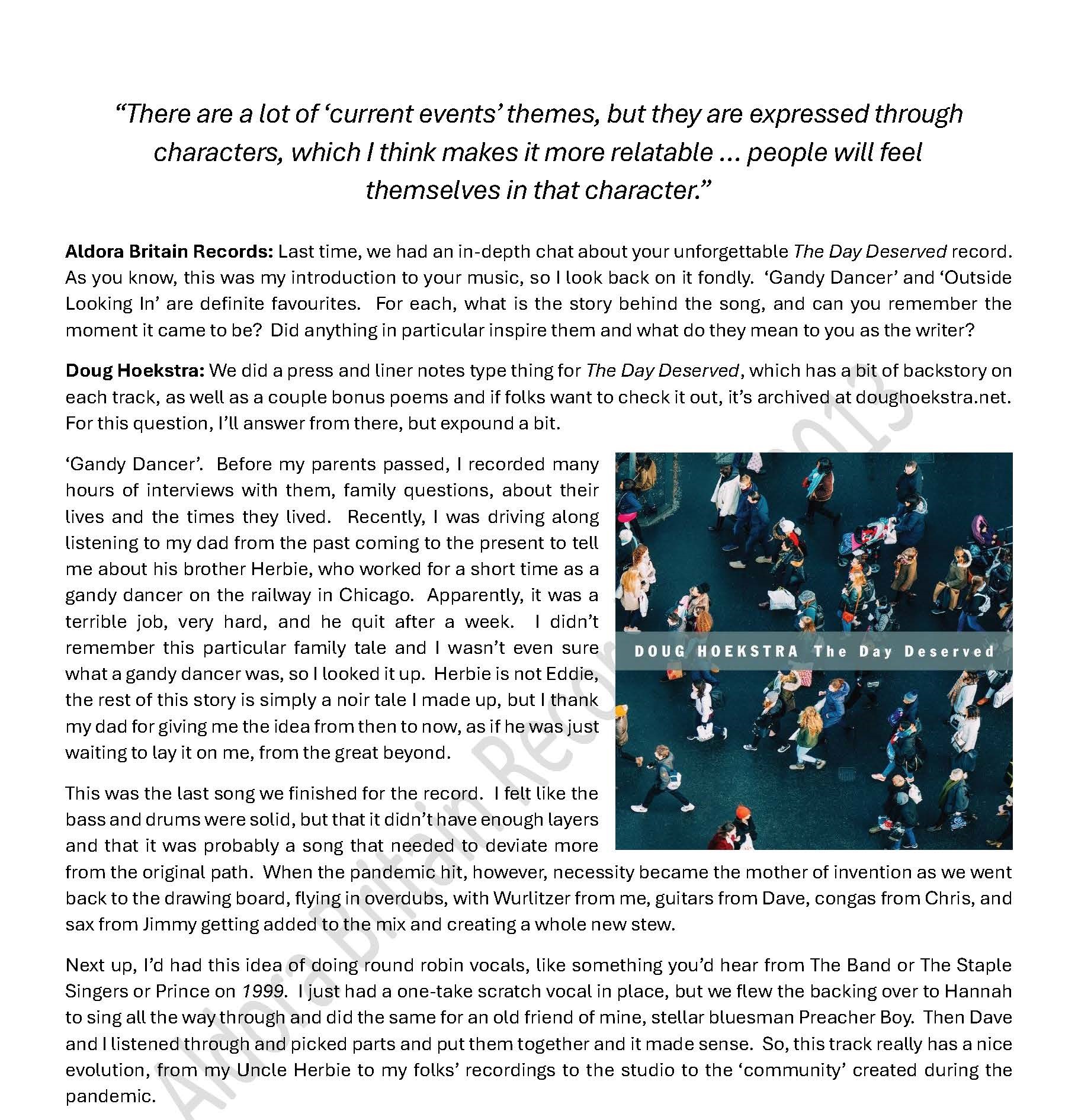 “Singer-songwriters are two a penny in the modern climate, and justifiably so, with all the widespread tumult happening across the globe. It has become increasingly difficult to stand out from this crowded stage, but experienced Nashville based troubadour DOUG HOEKSTRA does this with a relative ease. A case in point is his most recent studio album, 2021’s The Day Deserved, a ten-song set that delves into rootsy Americana whilst also garnering comparisons to Pete Shelley and The Velvet Underground. This eclectic foundation translates to Doug’s lyric writing too, a selection of paeans, ballads, and rock and rollers. As The Day Deserved now passes its third anniversary, this modern-day troubadour marvel took some time out to once again speak with Aldora Britain Records about his life in story and song so far. We discuss his approach to songwriting and songcraft, popular original compositions, deep cuts from his back-catalogue, and much, much more.”