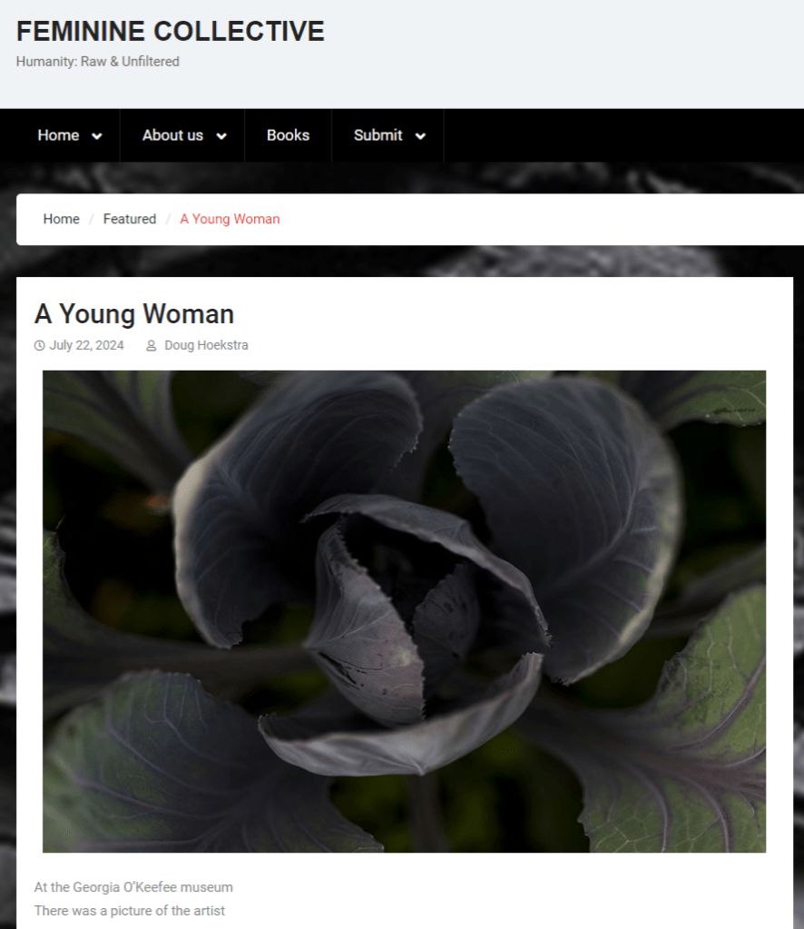 Pleased to share “A Young Woman,” which was just published at Feminine Collective, a stellar lit publication featuring poems and stories by writers dealing in “humanity, raw and unfiltered.” Founded a decade ago by writer/model Julie Anderson, FC’s mission is to empower, enlighten, and entertain.” As always, chuffed to be included, much thanks to Julie and FC.