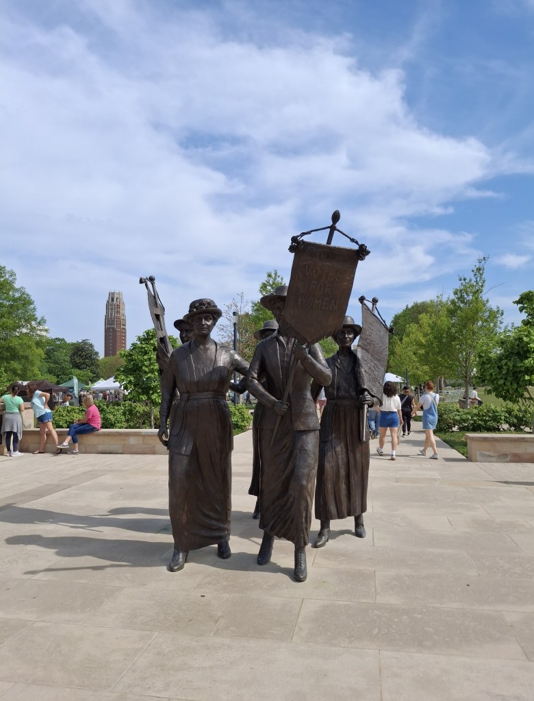 The park has been spruced up a lot since I first moved to Nashville – Cockrill Springs, hidden for a century, has been rediscovered and revealed, and the suffragette statue by Alan LeQuire stands in a more promient place, as it should. The five women honored in the monument were present during the final ratification battle in 1920: Anne Dallas Dudley of Nashville; Abby Crawford Milton of Chattanooga; J. Frankie Pierce of Nashville; Sue Shelton White of Jackson; and Carrie Chapman Catt, national suffrage leader who came to Tennessee to direct the pro-suffrage forces from the Hermitage Hotel. Fitting for a protest day.