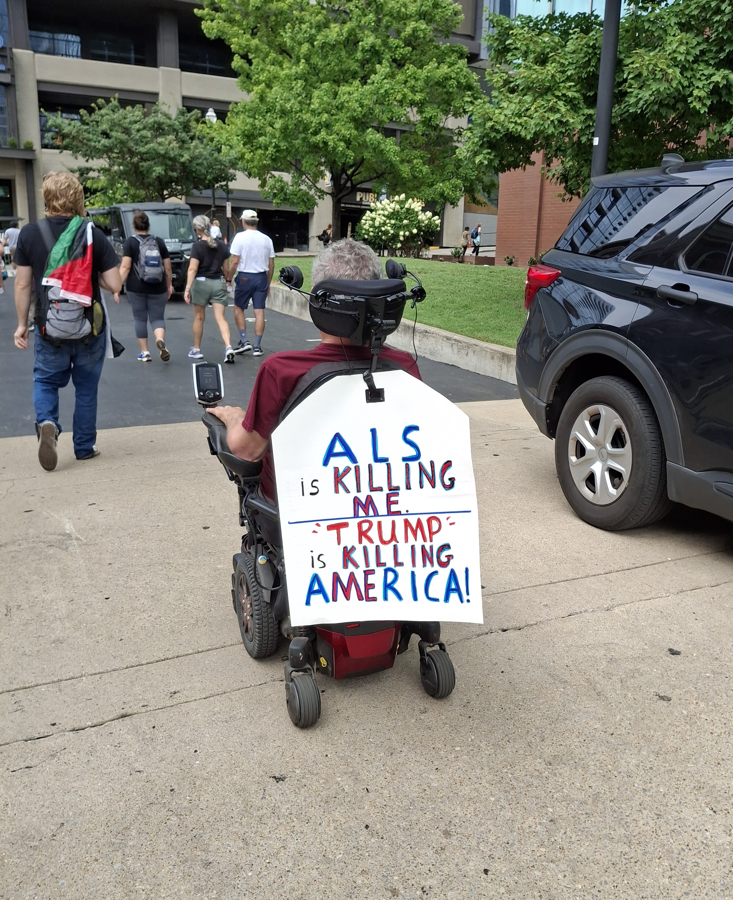 After that, the march took us down John Lewis Way, past where the historic Woolworth lunch counter sit-ins took place, past a mural honoring the man, to the Ryman Auditorium, where someone hung an upside-down flag on the statue of Captain Tom Ryman, which I thought was a perfect touch. As I left, I saw this sign on the back of this man’s motorized wheelchair, which just goes to show that, yes, we can all do something.